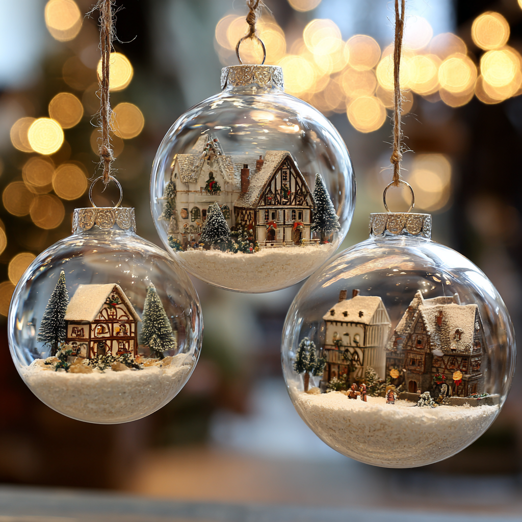 Grab a pack of clear plastic ornaments (they pop open in half), fake snow or Epsom salt, and small miniatures like trees or reindeer.