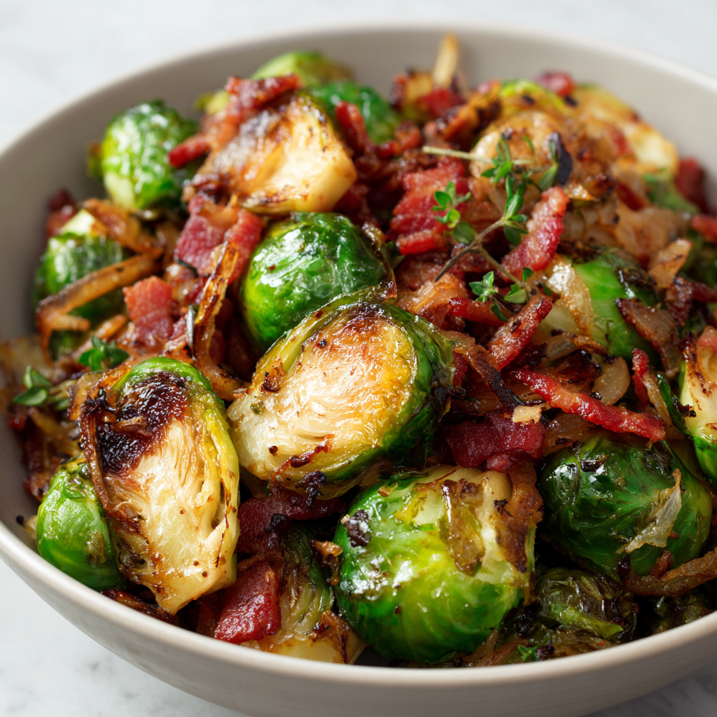 Slice them in half, roast until caramelized, then toss with crispy bacon bits and a drizzle of balsamic glaze. It’s the perfect balance of smoky, sweet, and savory.