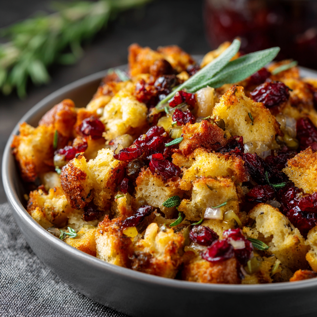 Mix cubed bread, sautéed onions, celery, cranberries, and sage. Bake it until the top is crisp but the inside stays moist and buttery.