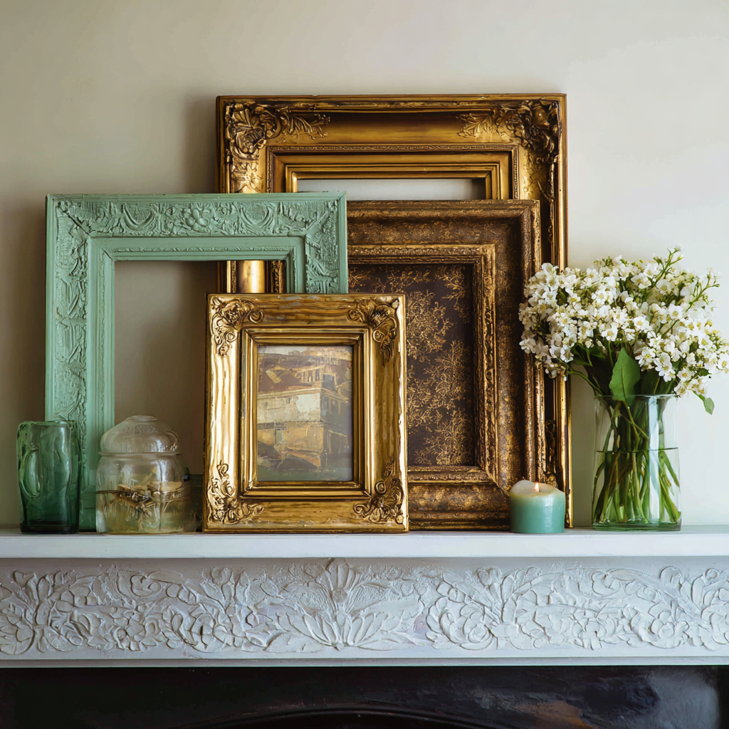 Lean a few vintage-style frames against the wall behind your decor.