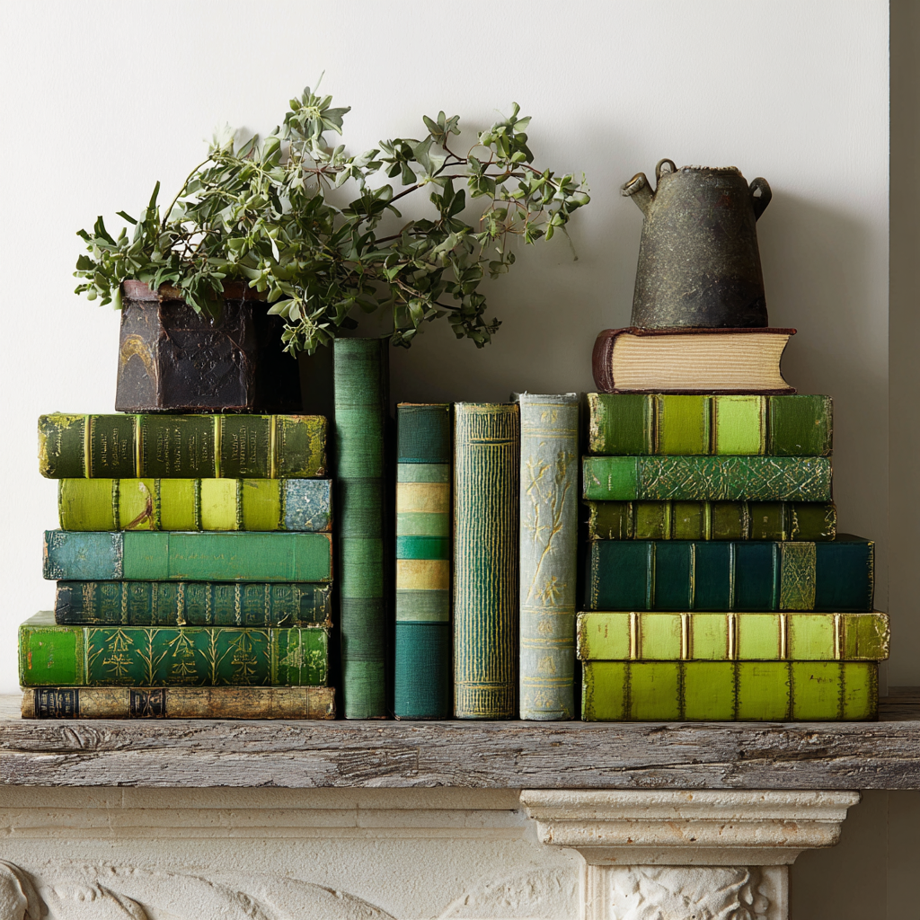 Stack a few green-covered books horizontally to create height variations.