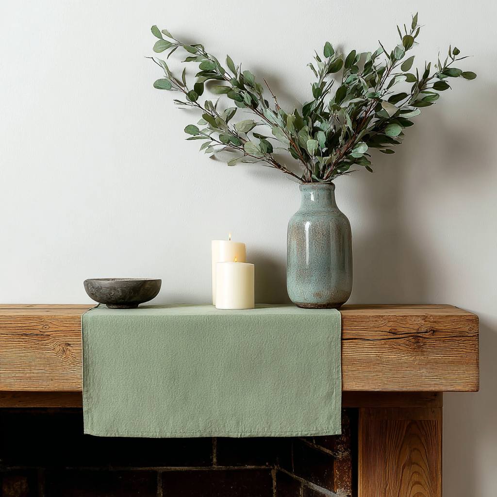 Lay a soft green fabric runner across the mantel before placing decorations.