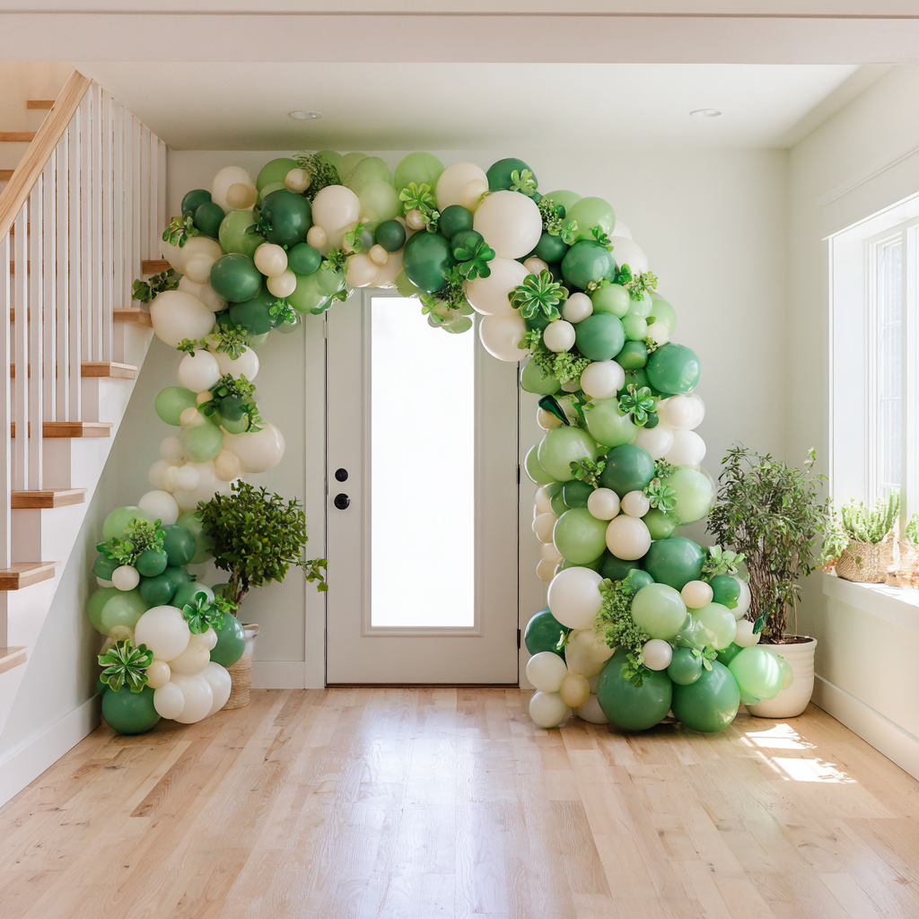 Stick to green, white, and gold balloons for a classic St. Patrick’s Day palette. Adding a few shamrock-shaped balloons makes it even more festive.