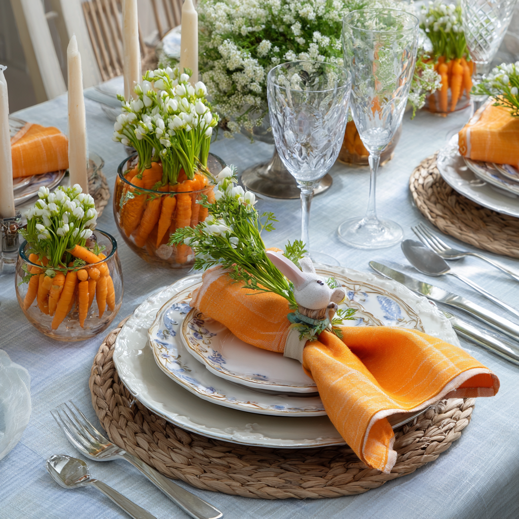 Add mini faux carrots inside clear vases, or use carrot-themed napkin rings for a subtle seasonal nod.